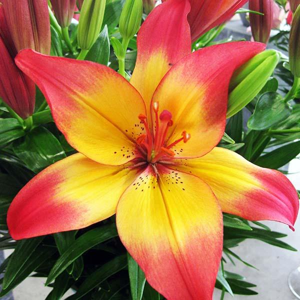 Цветок крупный, двухцветный - желтый с красным. Лепестки слегка волнистые. Очень эффектная лилия.