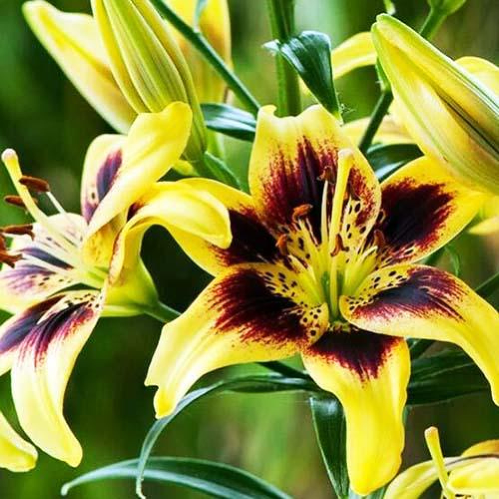 Лилия Пайтон относится к виду тигровых гибридов. Цветки крупные, диаметром 15-17 см. Лепестки чалмовидные, направлены с в стороны и вниз, окрашены в желтый цвет с винно-красными широкими пятнами от центра.