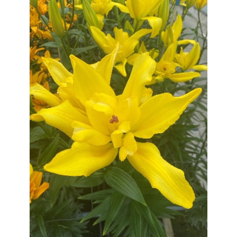 махровый, яркий, лимонно-желтый, необычная форма с удлиненными лепестками, очень крупный цветок