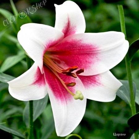 Лилия Цирано относится к виду Длинноцветковых гибридов. Цветки крупные, диаметром 17 см. Лепестки широкие, белые, с малиново-розово-фиолетовым центром. Форма цветка - широко открытая трубчатая. Нектарники ярко желто-зеленые, пыльники умеренно оранжевые, рыльце бледно желто-зеленое. Аромат несильный и приятный. Зацветает в июле-августе. Высота растения 100 см. Время посадки осенью - август-сентябрь или весной - в мае. Глубина посадки - 15-20 см. Расстояние между луковицами - 25-35 см. Расположение для посадки - открытые и затенённые места. Растение требует укрытия в первый год. Предпочитает нейтральную или слабокислую хорошо дренированную почву. Лилия Цирано неприхотливая, устойчивая к грибным заболеваниям, зимостойкая. Размножается луковичками - детками и луковичными чешуйками.