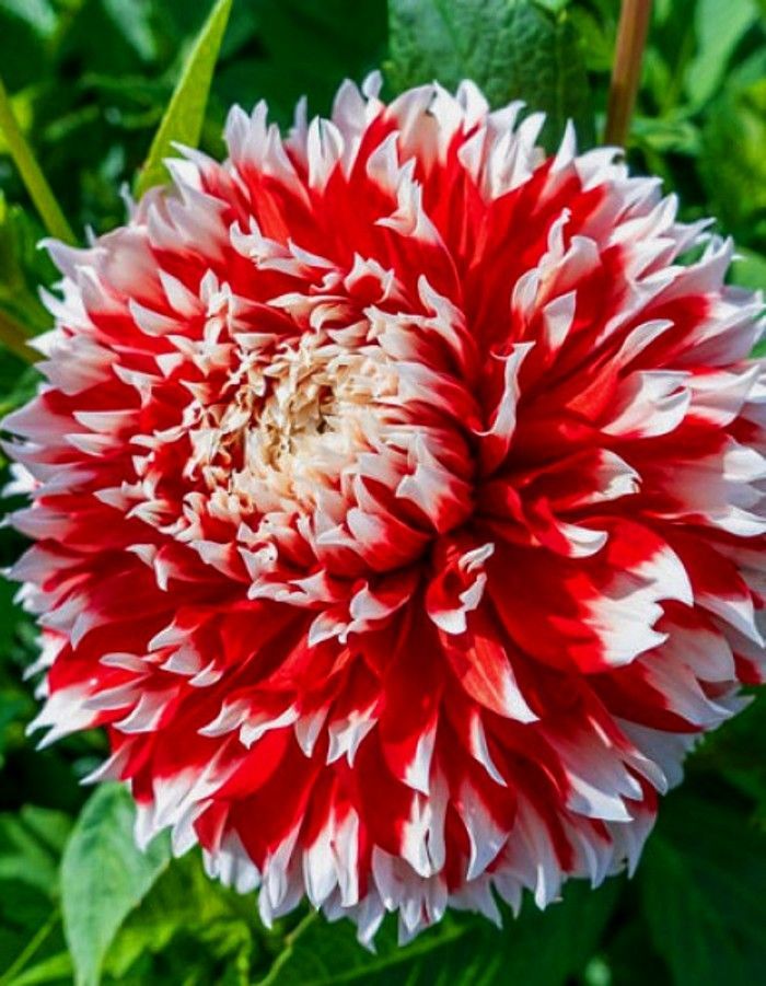 Георгин (Ноел) Noel шаровидная Ноэль - махровый, винно-красный цветок с белыми кончиками. Плоские язычковые цветки, слегка закрученные в трубочку плотно прилегают к друг другу образовывая шар. Высота растения - 100 см. Период цветения: июнь-сентябрь.