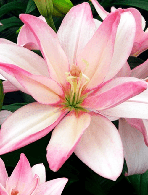 Сорт азиатской махровой лилии. Цветы окрашены в нежно-розовый цвет с более ярким краем лепестка, как будто легкий мазок акварели. Цветы достаточно крупные около 17 см в диаметре, лепестки собраны в несколько рядов, что и создает махровость.