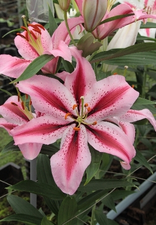 Чудесные розовые цветки с контрастными малиновыми полосами по центрам лепестков так и притягивают взоры гостей и соседей.