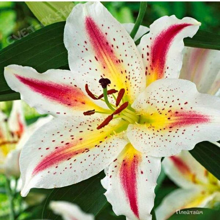 Лилия Плейтайм придется по душе всем, кто обожает создавать праздничную обстановку своими руками. В ней смешано сразу четыре оттенка, и это не считая окраса тычинок! Белоснежные лепестки служат подобием холста для широких двухцветных лучей, идущих от основания цветка и заканчивающихся у волнистых кончиков. От желто-розовых лучей расходится частый малиновый крап, тогда как точка расположения рыжих тычинок выкрашена в сочный оттенок лайма. Высота растения достигает 100-110 см, диаметр цветка – до 20 см
